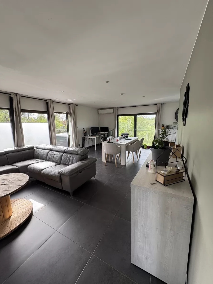 Rez-de-chaussée : hall d’entrée (8m²), séjour (38m²), cuisine hyper-équipée de 11m² (lave vaisselle, taques à induction, hotte, frigo américain, four, four à micro-ondes), salle de bain de 9m² (baignoire balnéo et douche à l'italienne), 2 chambres (11,5m² et 13,5m²), WC séparé et buanderie (3m²).